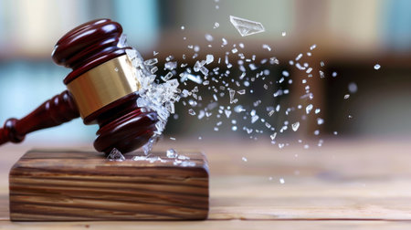 A visually striking image of a gavel breaking into pieces, symbolizing the impactful nature of law and justice in a courtroom setting.