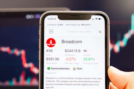 Broadcom stock price on the screen of mobile phone in mans hand with changing stock market graphs on the background, February 2022, San Francisco, USA.