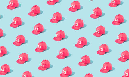 Trendy pattern with pink baseball cap on bright blue background.