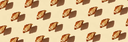 Banner seamless pattern levitating freshly baked buttery croissant with frangipan almond sprinkled with nut petals on beige background with hard shadow top view. Coffee, pastry shop breakfast concept.