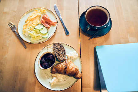Enjoy a delightful breakfast featuring sunny-side-up eggs, fresh salad, a buttery croissant, and steaming coffee in a bright cafe with natural light.