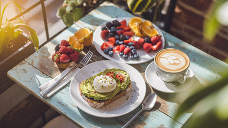 Healthy breakfast with oatmeal, avocado, eggs, berries and toast