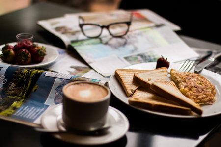 A breakfast table with toast, scrambled eggs, strawberries and coffee on a dining table with magazines