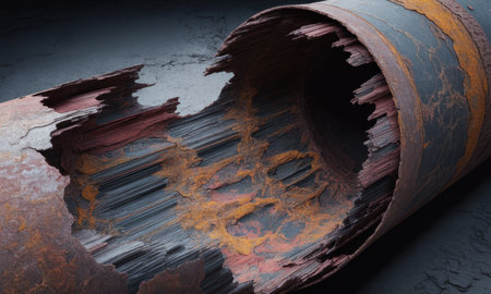 Severely corroded metal pipe with deep rust and peeling layers, showcasing intricate textures of material decay. represents industrial damage, deterioration, and aging infrastructure.