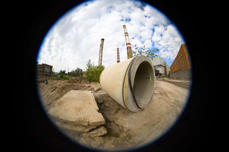 Ultra-wide angle. Industrial landscape with pipes and concrete slabs.