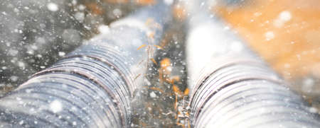 Metal pipeline in the street on a snowy