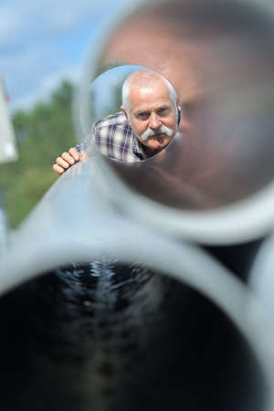 senior man looking through cement pipes in factory