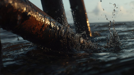 Close-up of dark fluid gushing from corroded metal pipes into a water body, symbolizing environmental impact.