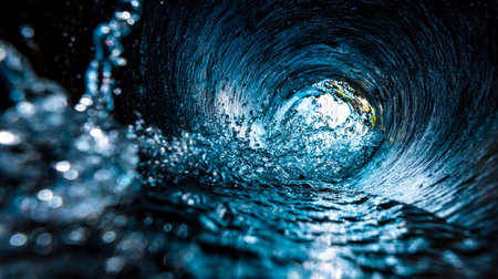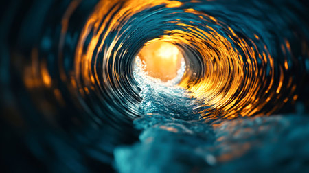 A stunning view inside a rounded water pipe showcasing flowing liquid with mesmerizing reflections of light creating a captivating scene.