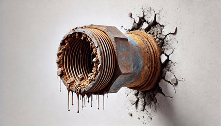 Rusty metal pipe leaking from a hole in a concrete wall.