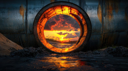 A vivid sunset seen through a large circular pipe, creating a contrast between industrial elements and natural beauty.