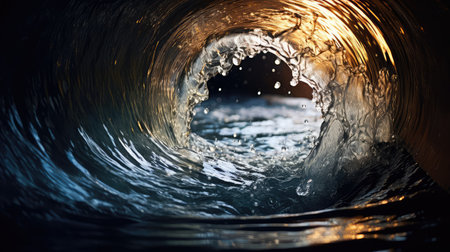 A captivating view inside a dark pipe, showcasing water flowing through a plumbing system in an urban environment. Ideal for construction or infrastructure themes.