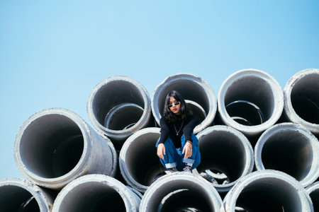 Black hair girl in sweater and jeans sitting on big concrete tube with knees up and release the arms under blue sky.