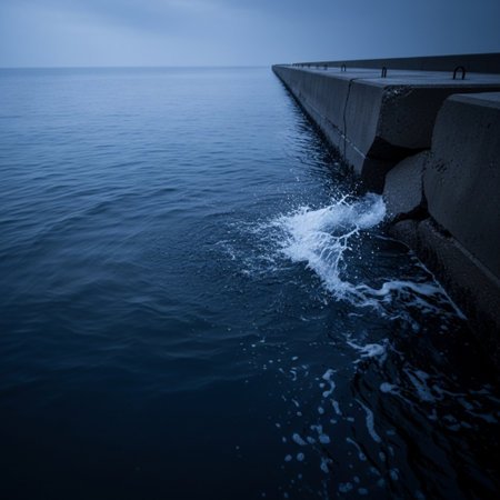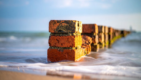 Close-up of stacked bricks forming a seawall with ocean waves flowing around them.