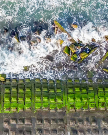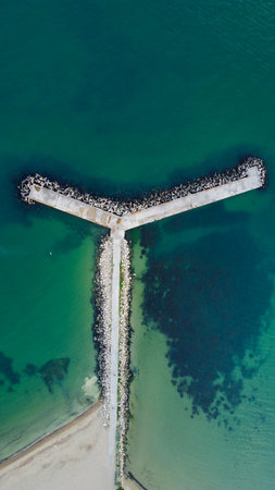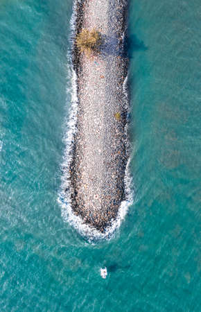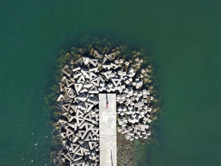 Aerial drone view of a breakwater. breakwater in the sea, a collection of concrete breakers