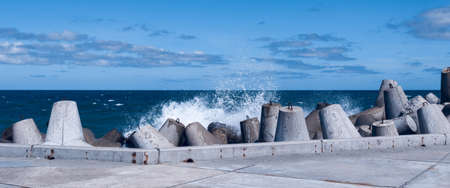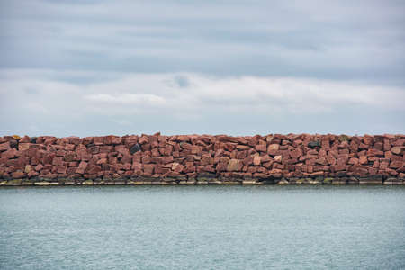 Figured concrete breakwaters protecting the entrance to the port on the Baltic Sea, Poland. harbor defense.