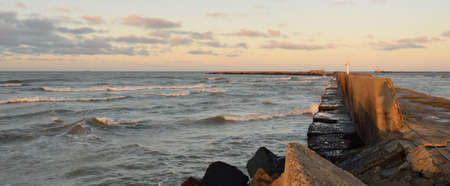 View from the old pier. Breakwaters close-up. Dramatic sunset sky, golden sunlight. Seascape, cloudscape. Baltic sea. Spring. Tourism, landmark, navigation