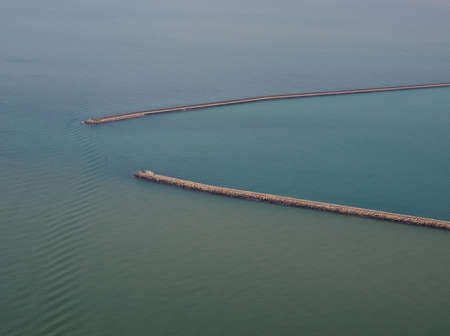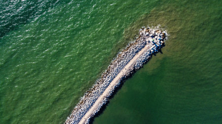 Aerial drone view of a stone breakwater or jetty in Baltic sea, Baltiysk, Kaliningrad, Russia at sunset. top view