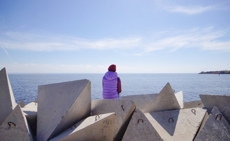 A young woman in a hat on a sunny spring day sits on the breakwaters and admires the sea. Girl in warm clothes on the breakwater.