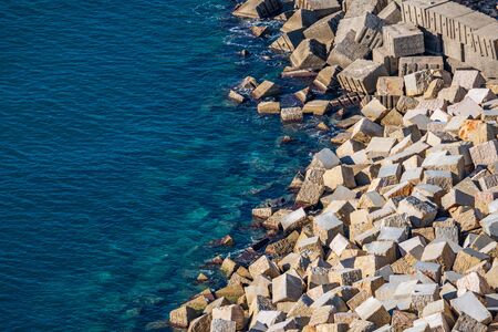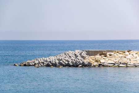 concrete blocks of a breakwater on the seashore. The Mediterranean Sea off the coast of Turkey