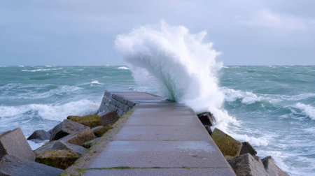 A powerful wave crashes against a stone jetty on a stormy day, showcasing nature's raw energy against the turbulent sea and dramatic cloudy sky.