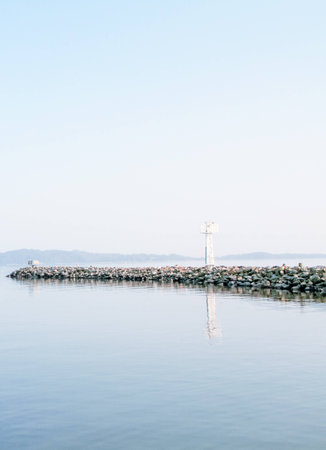 calm sea beach in summer with large rocks and wooden poles from old breakewater in the sea. blue sky