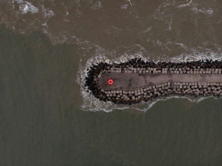 Aerial panorama view of breakwater wavebreaker dam with red lighthouse at Scheveningen beach The Hague Netherlands Europe
