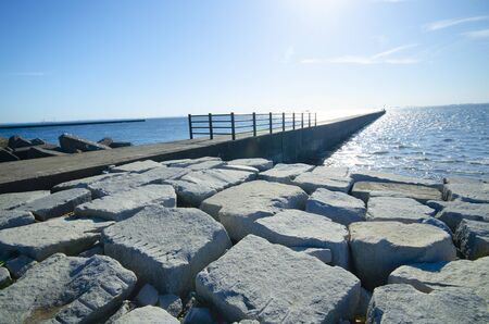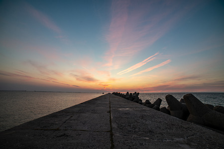 concrete breakwater on the Baltic Sea at sunset. Toned.
