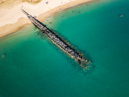 Aerial view or drone photo of rocky pier or breakwater in the blue ocean. Costa Da Caparica, Setubal, Almada, Portugal