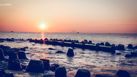 Beautiful sunrise over the beach in long exposure. Moving elements sunrise and wave photography from the rocky beach in india. Wave breaker rocks, slow-shutter Sea Waves and Rocks photography.