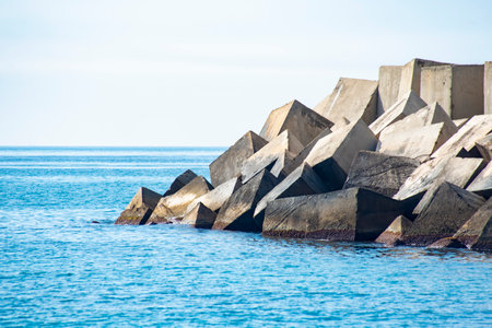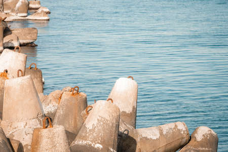 Coast breakwaters protecting from large waves with sea water background. The seashore is reinforced with concrete tetrapods.