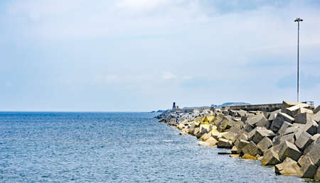 A big pier of large stones on the Atlantic coast, Espinho, Portugal.