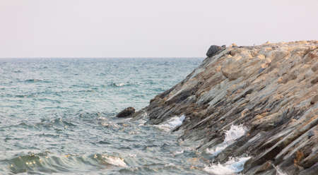 Sea waves breaking on rocks with water splashes on cloudy sky background
