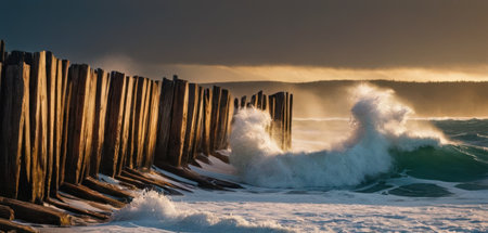 Dramatic shot of a wooden breakwater found at Hornsea Beach, East Yorkshire, UK.