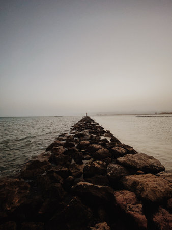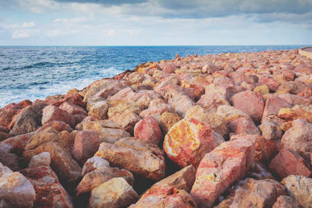 Rocky beach with red and orange stones. Seashore along Harry S. Truman Street, Tel Aviv-Jaffa, Israel