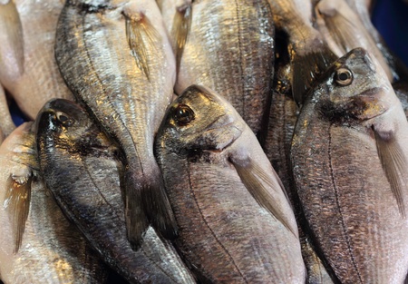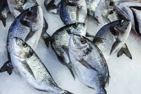 Gilt-head (sea) bream (Sparus aurata) or Orata stand in a fish market on a street as background in Athens, Greece