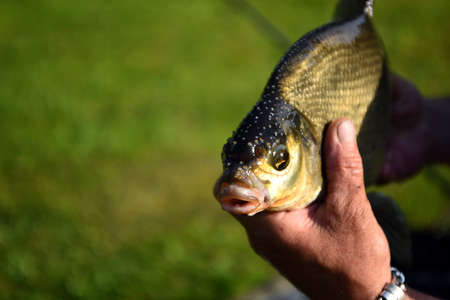 Fisher man holding in his hand caught, river fish on the background of the river.
