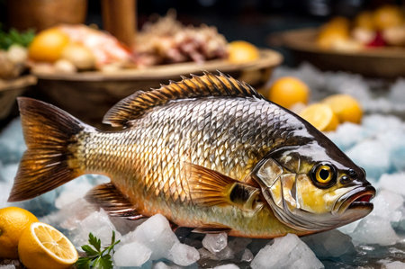 Fresh raw tilapia fish on ice with lemon and rosemary