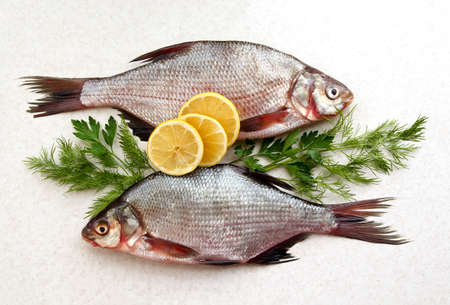 Two raw fresh fishes on marble table with lemon, dill and parsley. Crucian fishes. top view, flat lay.