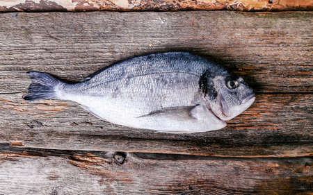 Orata fish on wood background. Fresh dorado, seabream, raw gilt-head bream, dorada, uncooked dorade, doraden or sparus aurata sea fish top view