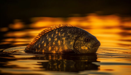 Golden carp swims in tranquil pond, reflecting natural beauty generated by artificial intelligence