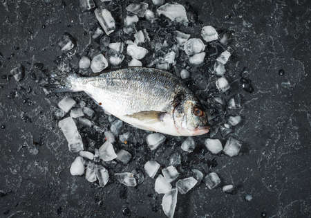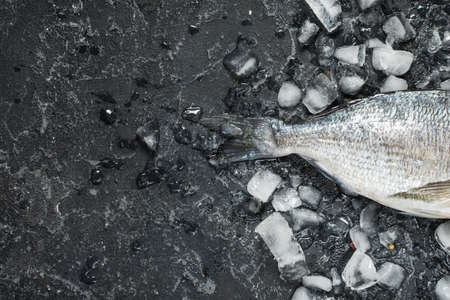 Raw fresh dorado on ice over dark stone background. Top view and copy spacev
