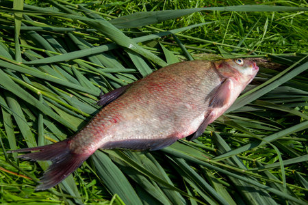 good catch. Just taken from the water big freshwater common bream known as bronze bream or carp bream (Abramis brama) on green reed.