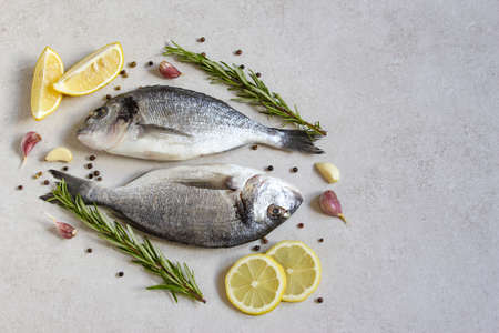 Two fresh raw sea organic dorado or sea bream with spices and lemon on a gray background. Copy space. Top view