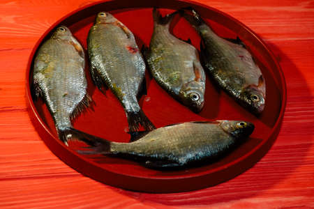 Fresh fish. Raw fish on red background. Fish on a red wooden plate on the table