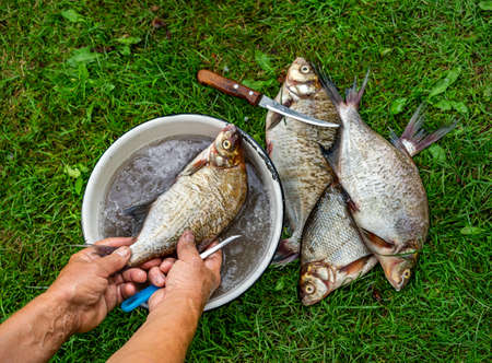 Women's hands cleaning fresh fish from scales in plate of water on background of green grass
