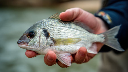 The fisherman is holding the fresh fish he has caught. Bream.
