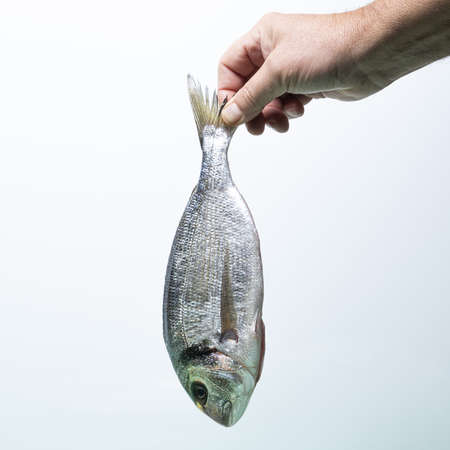 a sea bream held with one hand with the white background