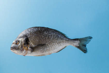 Close-up with a dorado fish isolated on a blue background. Single fish minimalist on a seamless colored background.