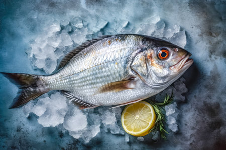 top down view of raw sea bream fish dorado on ice. Health food. space for text. generative AI.